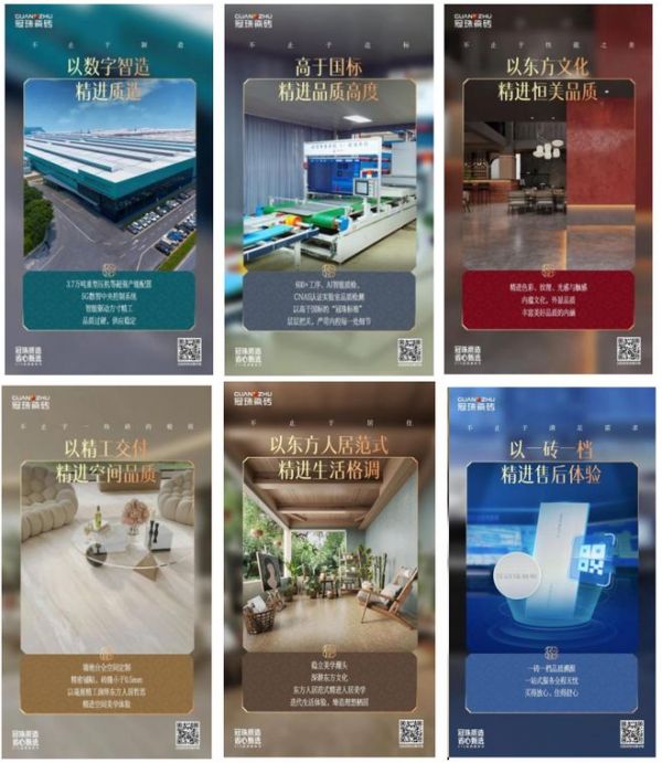 以冠珠瓷砖315品质服务月为抓手,近年冠珠瓷砖选择携手不同领域的品质代表,通过名人标签与流量来深化品牌的品质IP,成为品牌传递“精进”文化的重要载体。例如:2022年与影后惠英红共话“坚持就会更好”,2023年与金牌经纪人霍汶希共话“为爱严选”,2024年与多边形艺人刘恋共话“突破成就大美品质”,2025年与高级定制服装设计师郭培共话“惟质 致美”。今年3月,冠珠瓷砖联合著名导演王潮歌跨界推出“精进·质无止境”品质主题片。