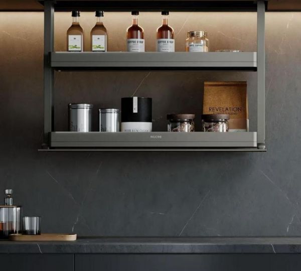 智能消杀碗碟拉篮:采用智能电动升降设计,搭载等离子杀菌、65℃恒温烘干与仿生超声驱虫功能,采用多模式智能巡航消杀,内部搭配下沉式扩容区与太空舱碗碟架,子母联动全抽结构,产品选用加厚不锈钢珠花板与氟碳喷涂工艺,坚固耐用、防腐易清洁,搭配优质导轨,通过长时间开合测试,承重力强,兼具美观与实用性,提升厨房使用体验。