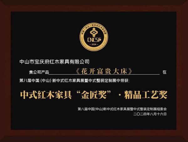这份对品质的执着,也收获了行业的认可:先后斩获第二届、第三届中山市工艺家具鲁班奖,2024年更拿下中式红木家具“金匠奖”・精品工艺奖……这些荣誉,是对宝庆府红木工艺与品质最实在的背书。