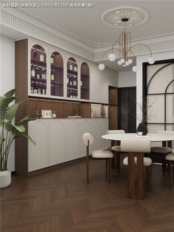 全屋通铺暖棕色鱼骨拼木纹砖,独特的“V”字形纹理像流动的琴键,从客厅延伸到餐厅,让整个空间有了明确的指向性和纵深感✨。比起人字拼,鱼骨拼的拼接更规整精密,极好地契合法式风格的精致与秩序感。