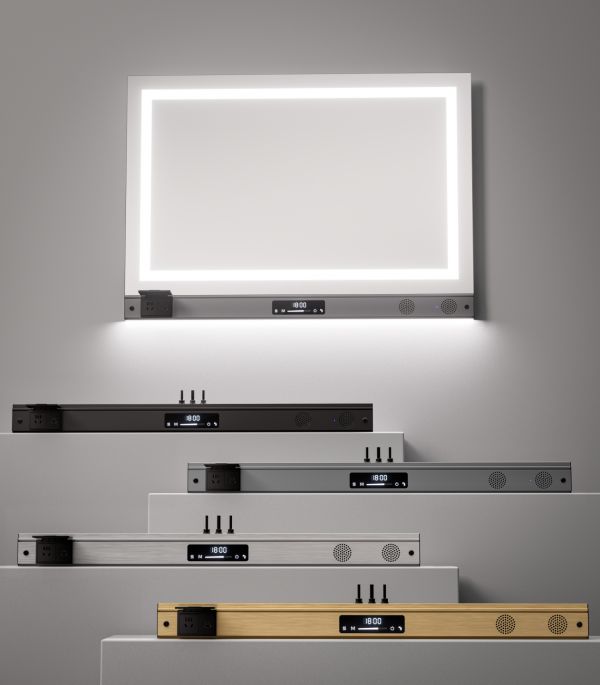 作为安装于镜面下方的“智能中枢”,卫浴镜灯多功能控制模块将智能调光、一键除雾、人体感应、蓝牙音响、时钟显示、双路取电、收纳扩展、健康模块八大功能融为一体,并支持功能自由组合,灵活尺寸、简约设计可适配不同镜面规格与空间风格。让普通镜子从“被动反射”进化为“主动服务”,从“照明配件”升级为“智慧中枢”,推动卫浴空间从“功能时代”迈向“智能时代”。