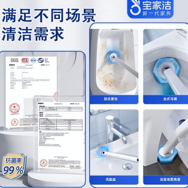 针对坐便器:刷头能灵活贴合坐便器弧形内壁,实现360°无死角清洁,结合99%的抗菌率与即用即抛设计,有效减少家庭环境下的细菌交叉感染风险,兼顾卫生与便捷。