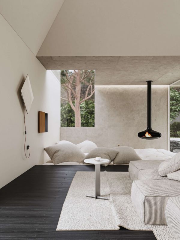 Ruth: 它是这个家的“心脏”。 传统的客厅往往围绕电视布置,但我们希望打破这种陈规。这盏黑色的悬挂壁炉像是一个现代装置艺术,它不仅解决了取暖的物理需求,更营造了一个围炉而坐的情感中心。火焰的动感与周围素雅、静止的混凝土墙面形成鲜明对比,赋予了空间一种原始的生命力。