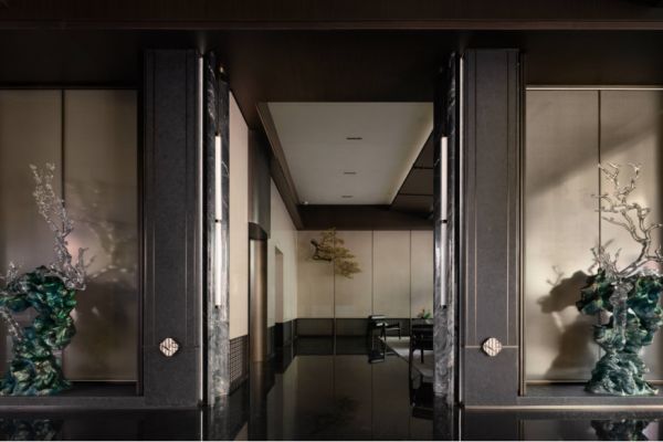 在整体空间组织上,项目没有把售楼处、公区与会所处理为彼此分离的功能容器,而是通过连续的空间叙事,把接待、停留、阅读、会谈、用餐与运动串联成完整体验路径。前厅以“山岳礼序”为开篇,通过穹顶、理石、水纹肌理、服务台、屏风与太湖石装置之间的关系,建立起更有秩序感的第一印象。这一空间的意义,不只在于审美气质的呈现,更在于帮助客户在进入项目的第一时刻,形成对品质感、归属感与项目调性的判断。