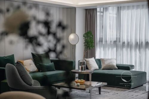 客厅拥有一大片的阳光面,设计师希望为公共区域营造精致感。因此借着通透的光照,选配墨绿色现代家具,而主景墙亦不加任何矫饰,延续整体空间的写意调性,与浅色背景共同打造了简约淡雅的氛围。