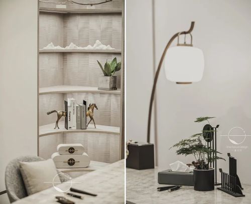 在微小细节上,各种透露着东方风雅的灯具、摆件与绿植,这些意趣在设计师手中被放大,共同回应着主人恬淡的生活方式。从客厅移步至书房。设计以景入画,窗外绿植和屋内书香相映成趣,让主人在忙碌之余也能享受到独处的趣味。