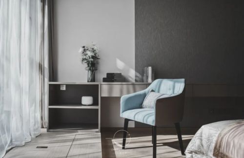 私享空间的设计,褪去华丽的外饰,设计师以细腻笔触表现对生活的细微与周到。?卧室的设计更表现了设计手法的纯熟和对生活的感知。女主人喜静,颜色以淡雅的灰营造宁静舒适的体验感。大大的落地窗,光线透过窗帘,温婉而律动,有一种别样的温柔。
