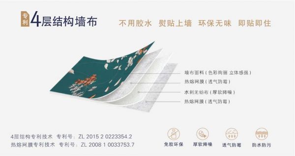 天洋墙布特有的四层结构与热熔网膜,均为天洋公司的专利技术(专利号:ZL 2015 2 0223354.2 ZL 2008 1 0033753.7),产品环保无味、熨贴上墙、8小时安心焕新。