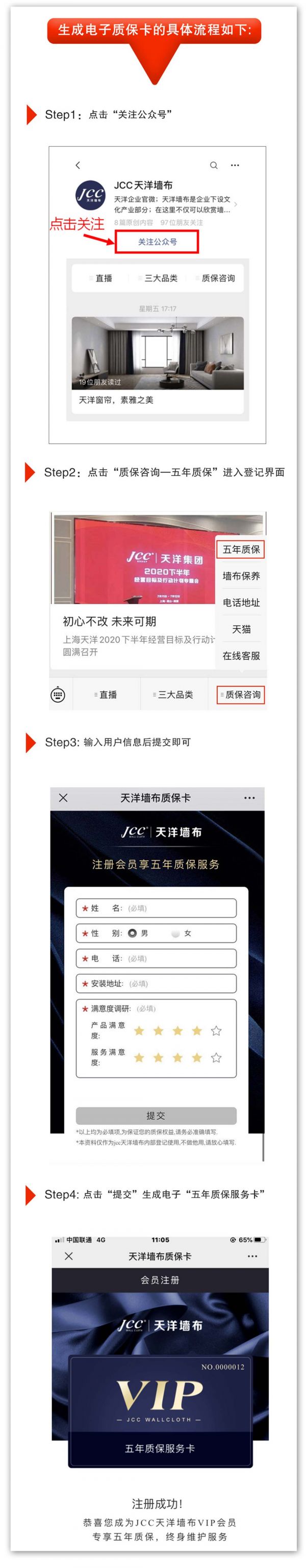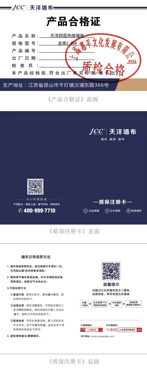 天洋的墙布及壁画产品均配有《产品合格证》及《质保注册卡》,消费者可通过扫码关注“JCC天洋墙布”官方微信,进入“质保咨询-5年质保-提交”填写信息,完成会员注册,生成电子质保卡,尊享五年质保。